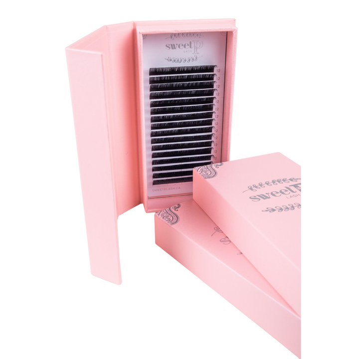 Sweet P's extensions are very easy to work with & fan beautifully. If you are used to working with a coarse/stiff lash, it is recommended that when doing VOLUME sets with Sweet P lashes, you may want to bump up a diameter while getting use to their extra soft texture.