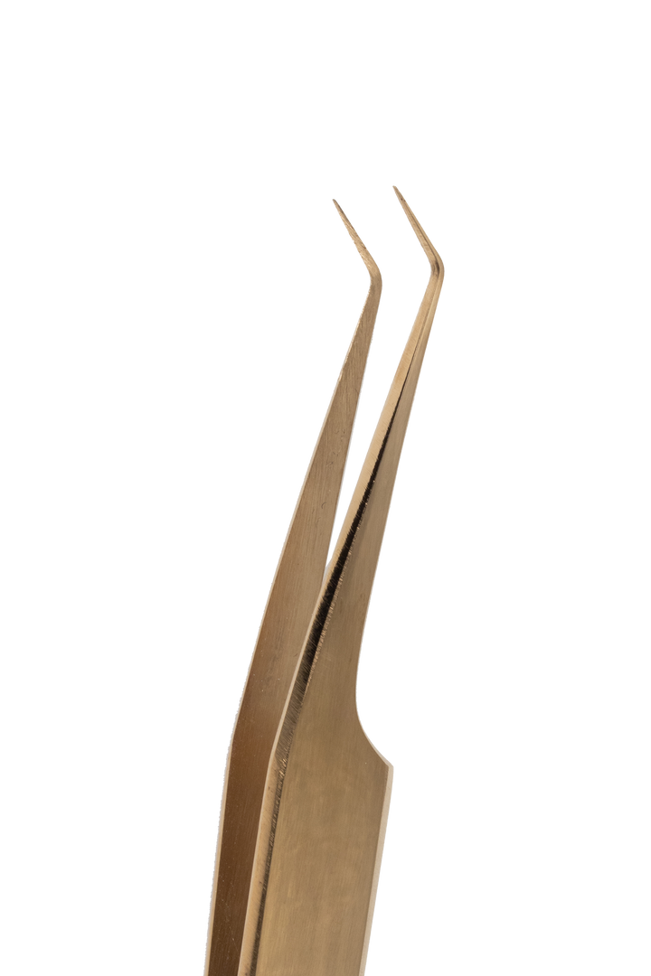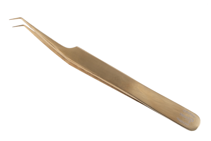 This moderate tension angled L tweezer is perfect for classic, hybrid, or volume sets.